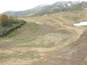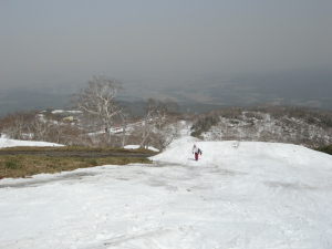 下からゲレ(もうゲレンデとは言えない)を見ると、見渡す限りの地面。雪なんてドコにもナーイ。