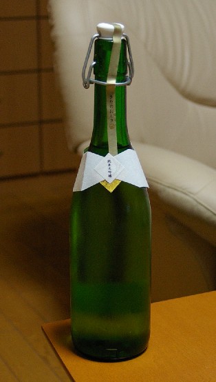 これがそのお酒。通いビンに詰めてくれます。手張りの封印シールが曲がっていて雰囲気を出してる?かな。