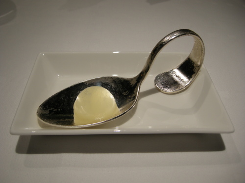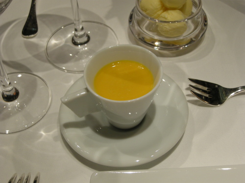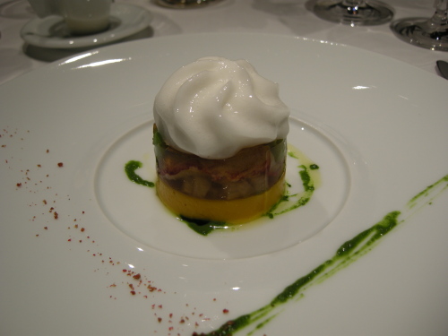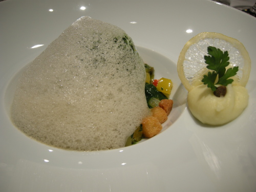 その理由は、前菜は皿に7品ある中で4品がムース系。サラダは上の白いところが泡。スフレは卵白の泡のドームの中にスフレがかくれてる。