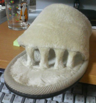 履いてる感じは、指のある靴下と似ている。面白いのは、多少ルーズな物?であるスリッパが、足にぴったりくっついてるということ。指と指で挟んでるからね。当然だね。