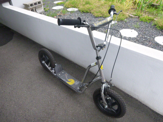 子供たちが乗ってるような、小さいウイールのやつとは違って、タイヤが付いてるから乗り心地もなかなか。