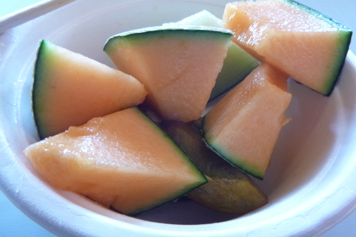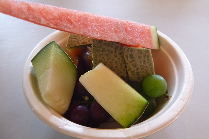 時間になって中に入ると、テーブルをつなげた長い台に、ブドウ4種、りんご、プルーン、トウモロコシ、メロン青・赤、ミニトマト、イモ、かぼちゃ、フルーツポンチ、が大皿に並んでいて、食われるのを待っている。