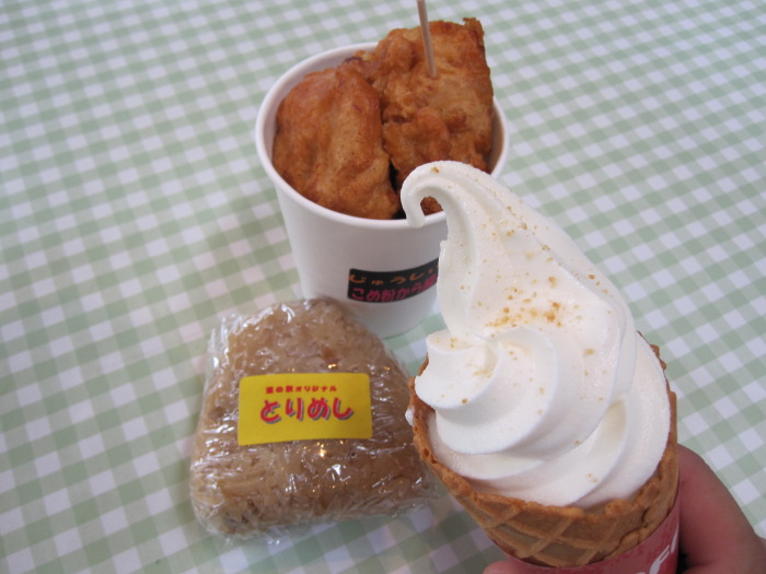 ライスソフトクリームと、朝食べてなかったから、とりめし+米粉唐揚げ。