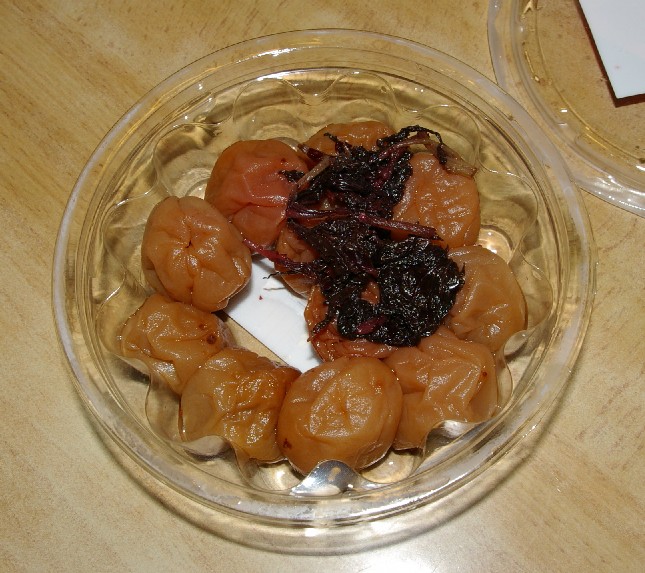 助けを待っていた所は、コンビニ、郵便局などがあってわりとひらけていた。バス停の駐車場脇に、三笠梅林邦梅園で採れた梅を使った梅干が売っていたので、しそかつお味甘口を購入、350円。