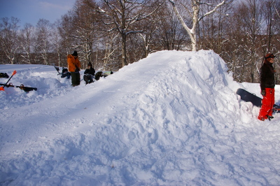 先週のキッカーを使い、前回の着地地点を回避する方向で、キッカーの向きに修正を加えながらみんなでモリモリします。あっとゆうまに、ゲレンデキッカー並の幅と長さを持った作品が出来上がりました。