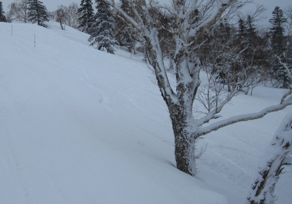 強風で殆ど飛んでしまっていても、いくつかのポイントではパウダーを楽しむことが出来た。