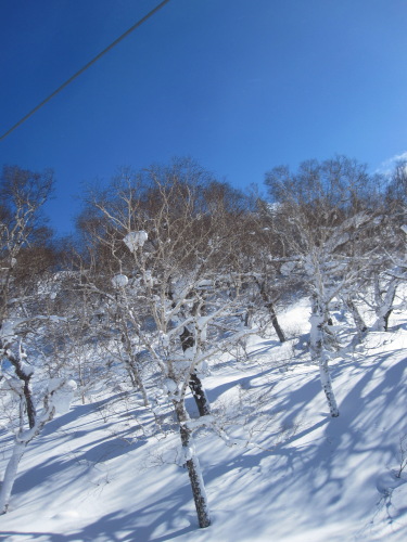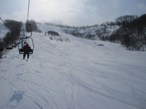 降雪、積もった雪、慣れないコース、酔いのせいで様子見しながらよちよち流してたところ、昼前に、スキーの大会で閉鎖されてたコースが再整備されてオープン!