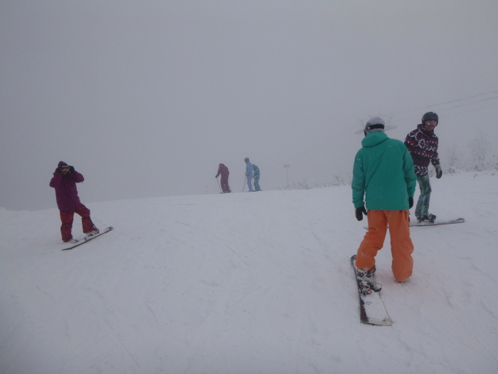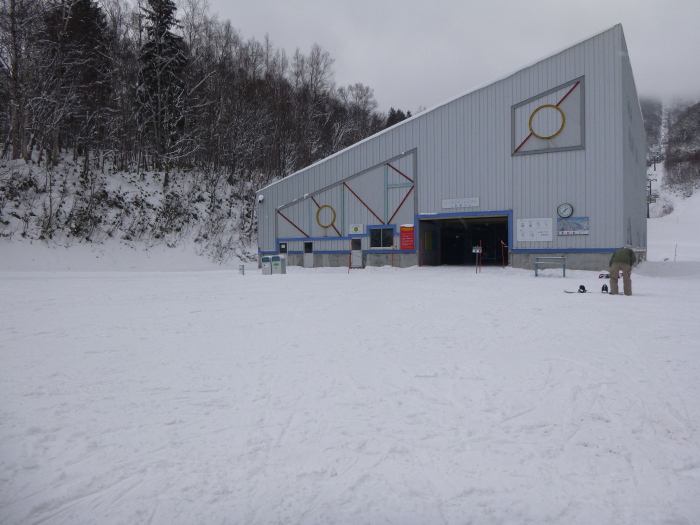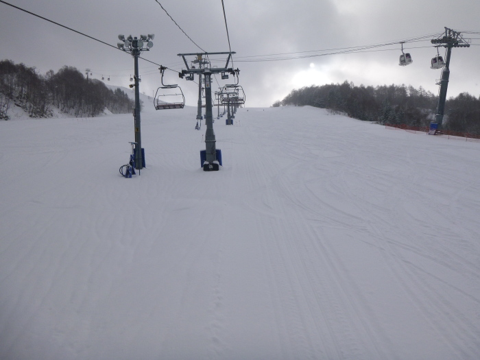 だったのが、山をひとつ越えると曇りだし、ゲレンデもどんより。