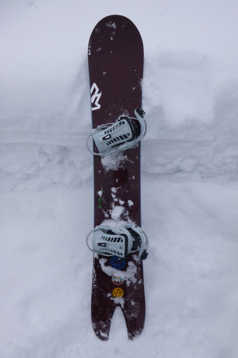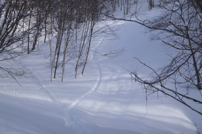 板はちょと硬めで、狭いツリーを流すときに取り回しの悪さを感じるけど、急斜の多いレースイの沢ならこれくらいの硬さの方がむしろ安心して突っ込んで行ける。
