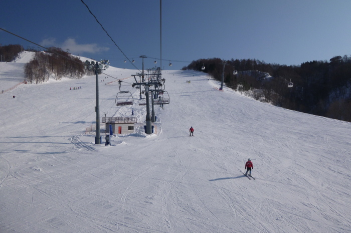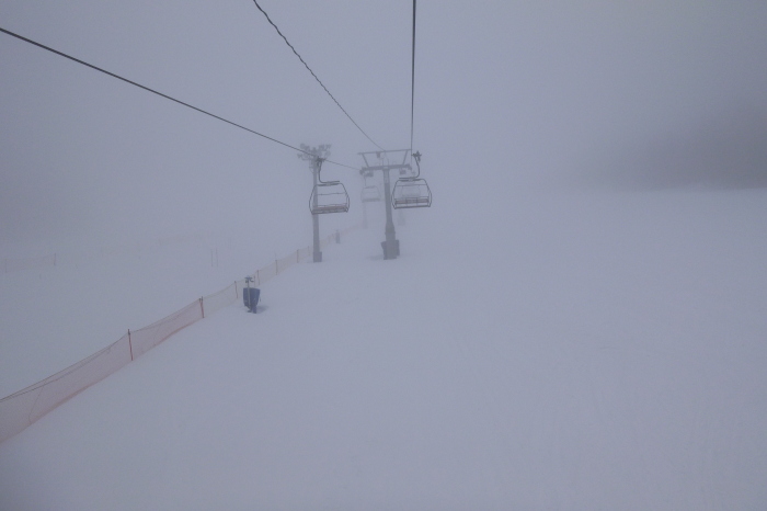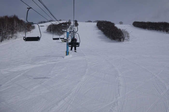 ゆっくり昼を過ごしてゲレンデに戻ってみると、なんと、強風でリフトが止まりまくって、ビギナーズ4しか動いてなかったから、今日はこれで終了。