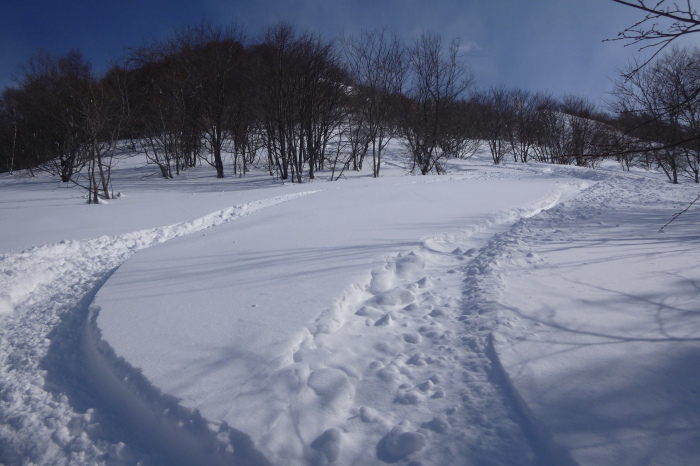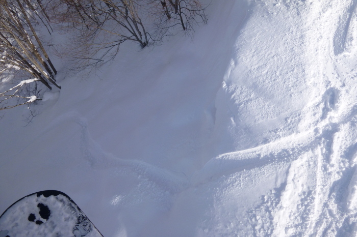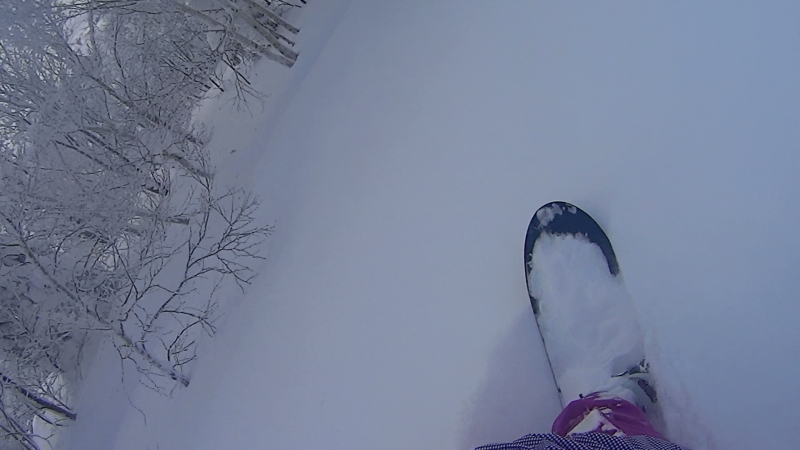 長嶺の中斜面と膝上の深い雪で、ノーズは出るけどテールがブレーキになる感じ。