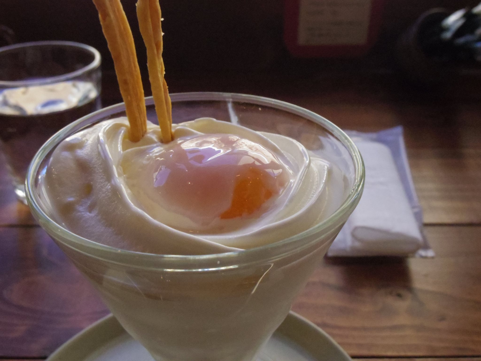 ソフトクリームに冷たい温玉をトッピングして、食べる時にはまぜまぜして食べるという。