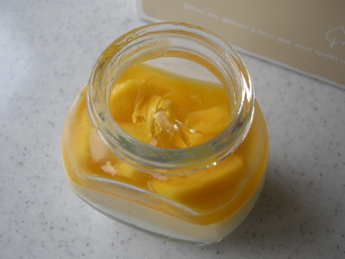 オレンジ色のはマンゴーで、多分生のまんま。缶詰みたいに甘く煮たりしてないのがいいですねー。