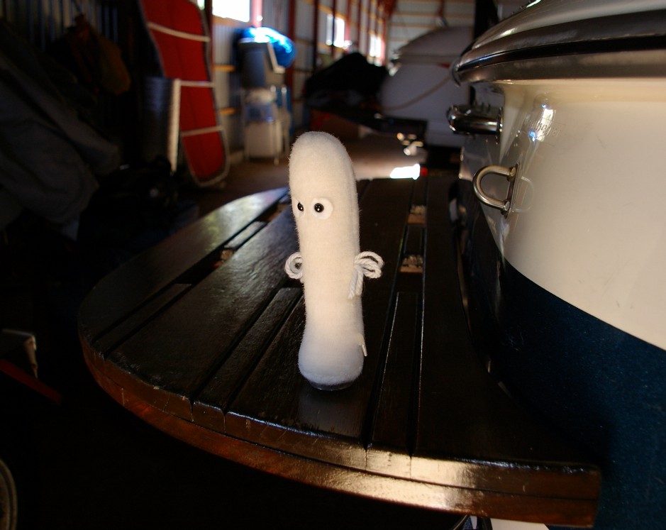 着いてみると、艇庫のなかは既に冬状態。通常はシャッターに対して垂直に停めてあるんだけど、冬は横に停めて、普段は洞爺にいない他の船も艇庫に保管する。管理人のM氏に聞きに行くと、その場で作業していいとのこと。心置きなく、庫内でマフラーから緑の液体を放出できます。